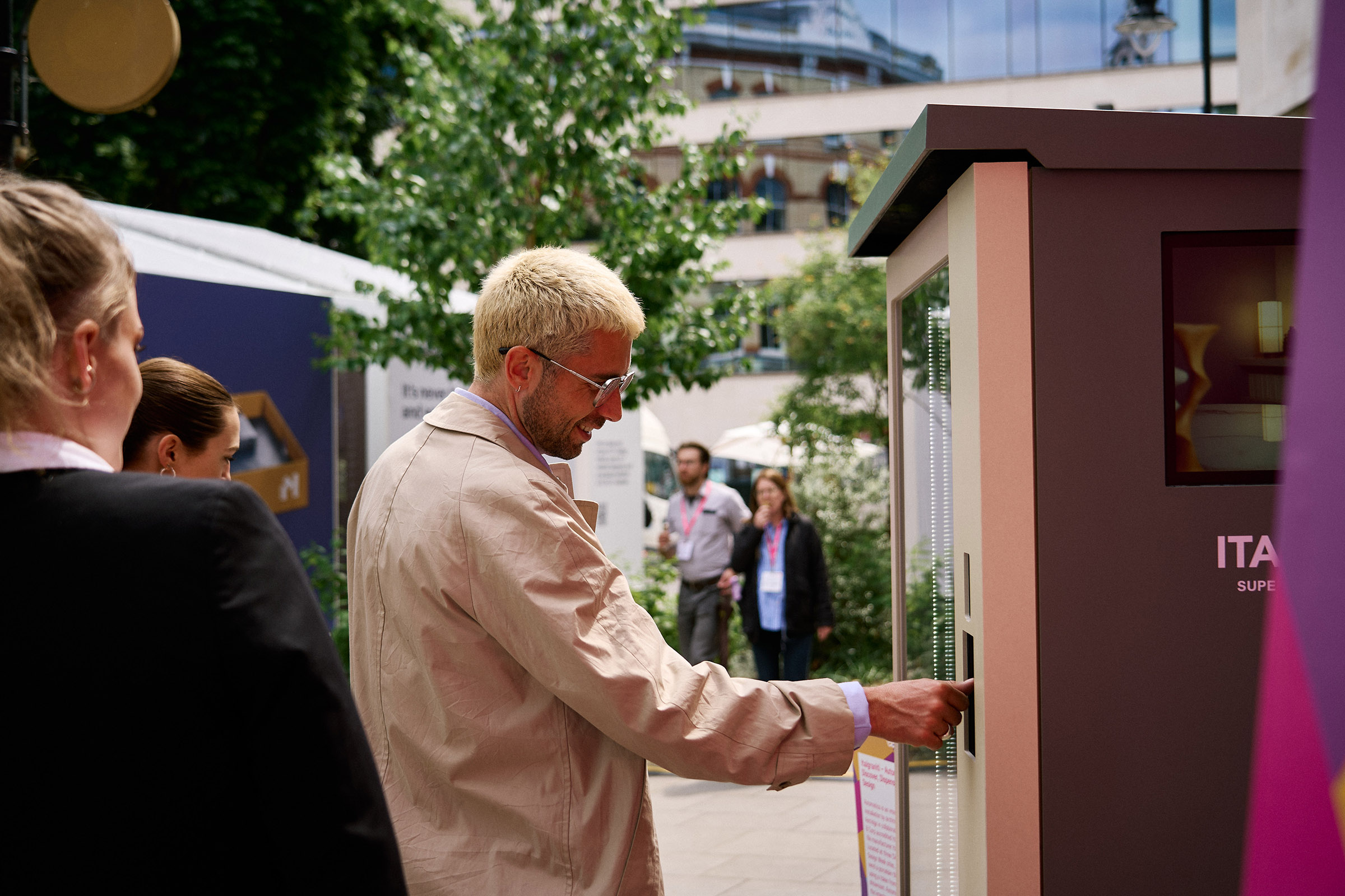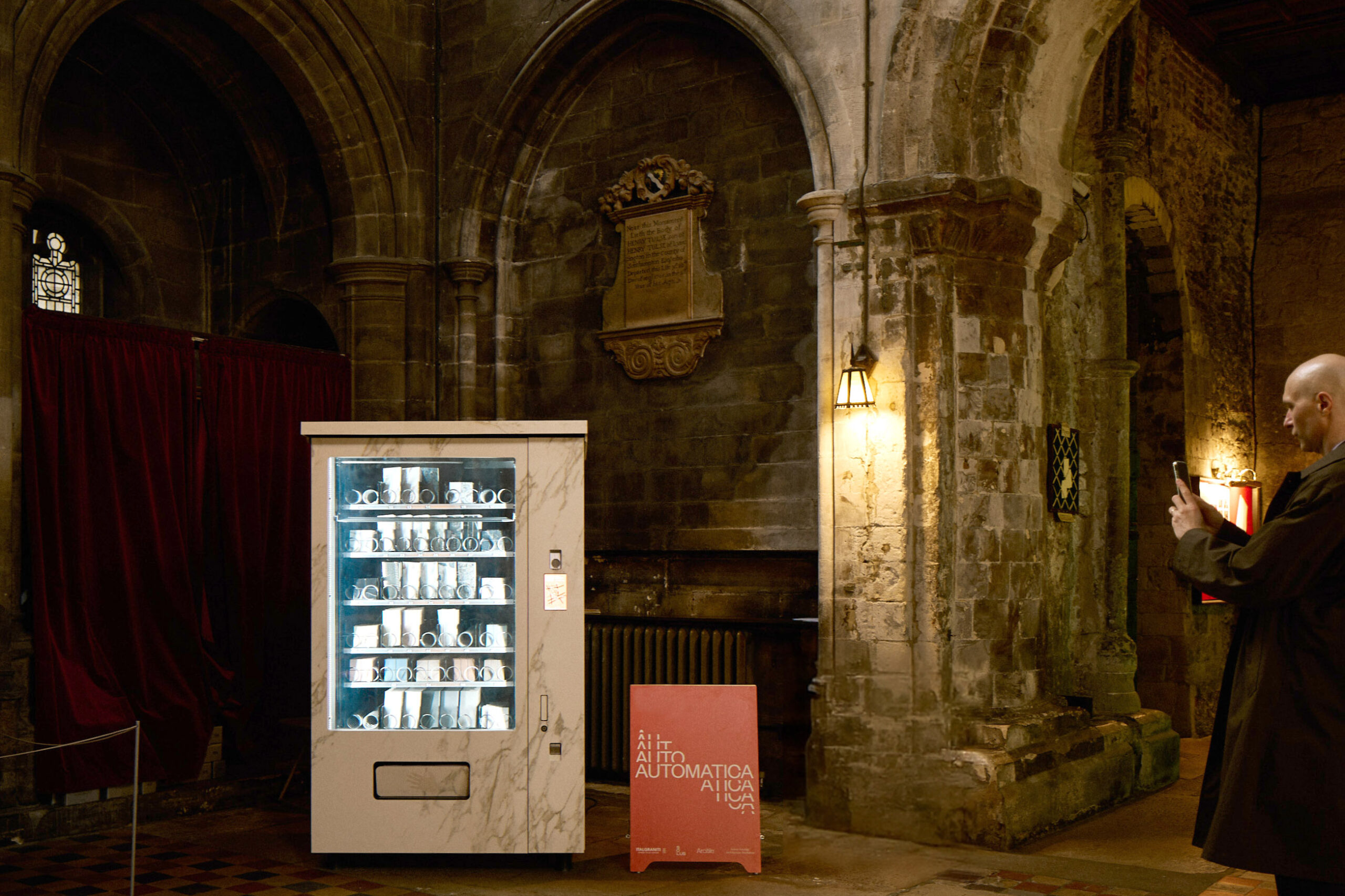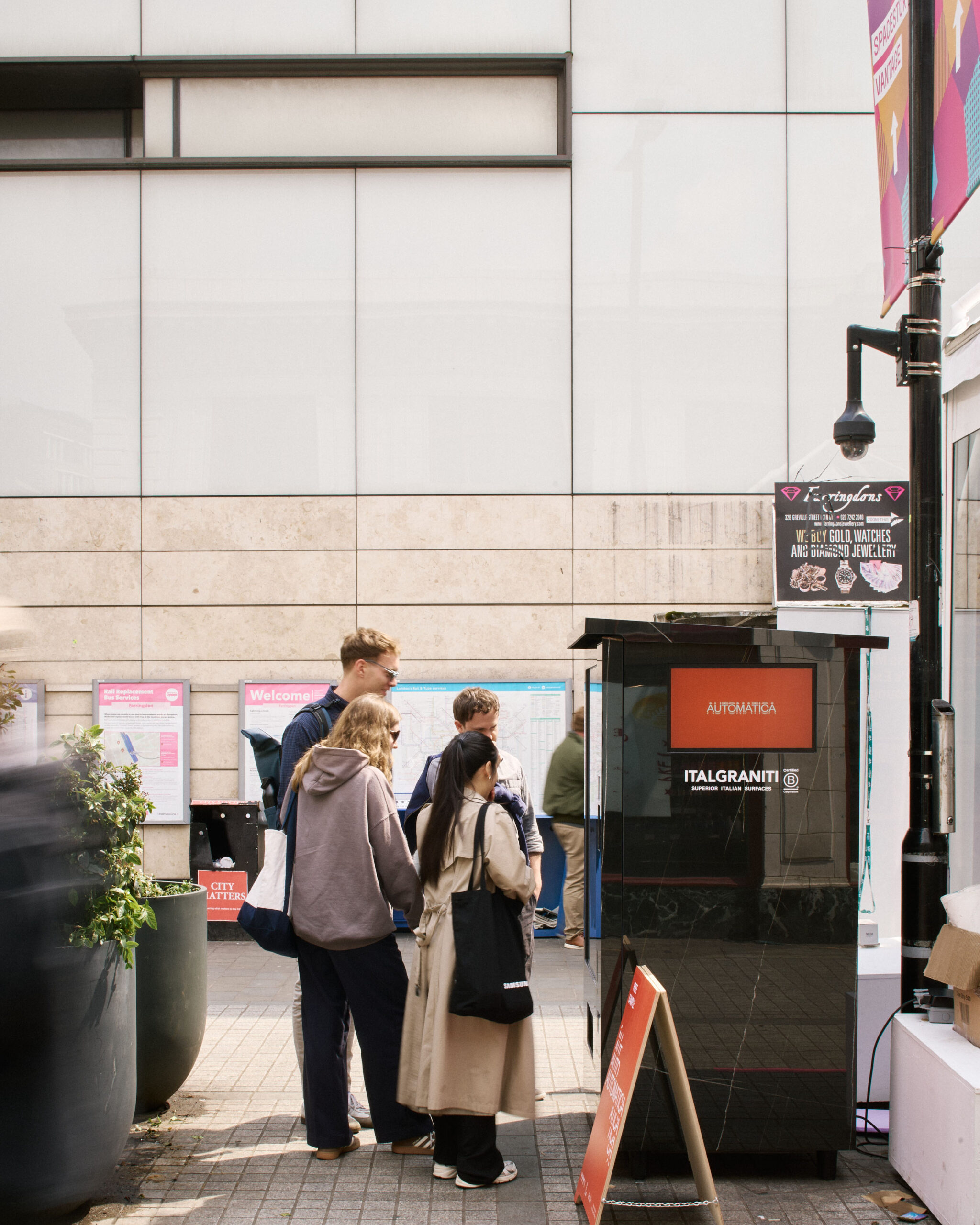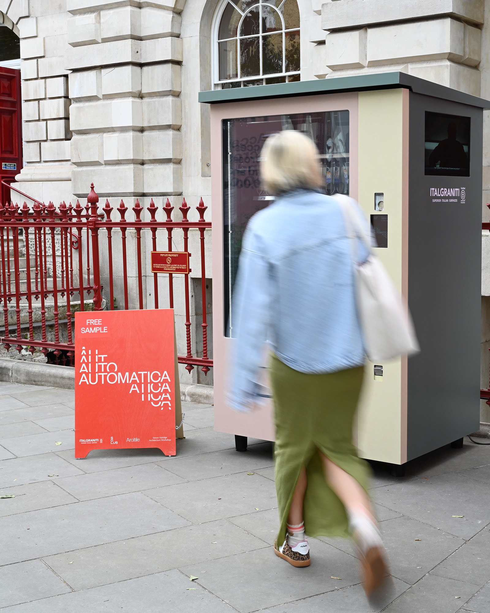 Like blocks of stone awaiting the sculptor’s hand, three vending machines stood quietly across Clerkenwell during Design Week 2025. Clad in Italgraniti porcelain, they weren’t selling snacks or drinks: they were dispensing tile samples. The project was called Automatica and we were the ones who made it happen.
